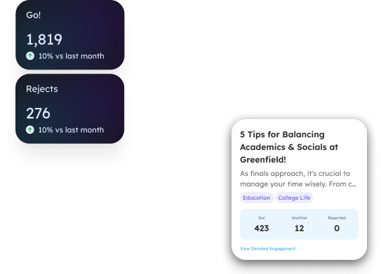 Share your authentic experiences and showcase your culture to create a sense of belonging that drives early commitment. Customize your outreach with GoGira!'s Intelligence Match System to align with your criteria, connect with more students, and use just-in-time data analytics to boost yields and spot trends early.